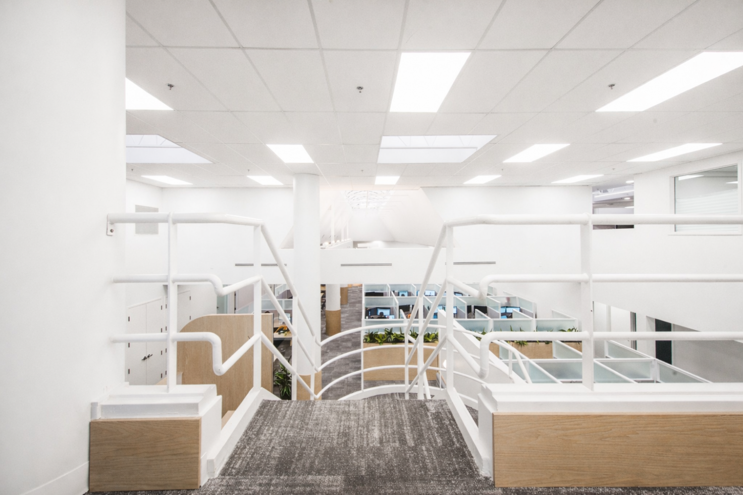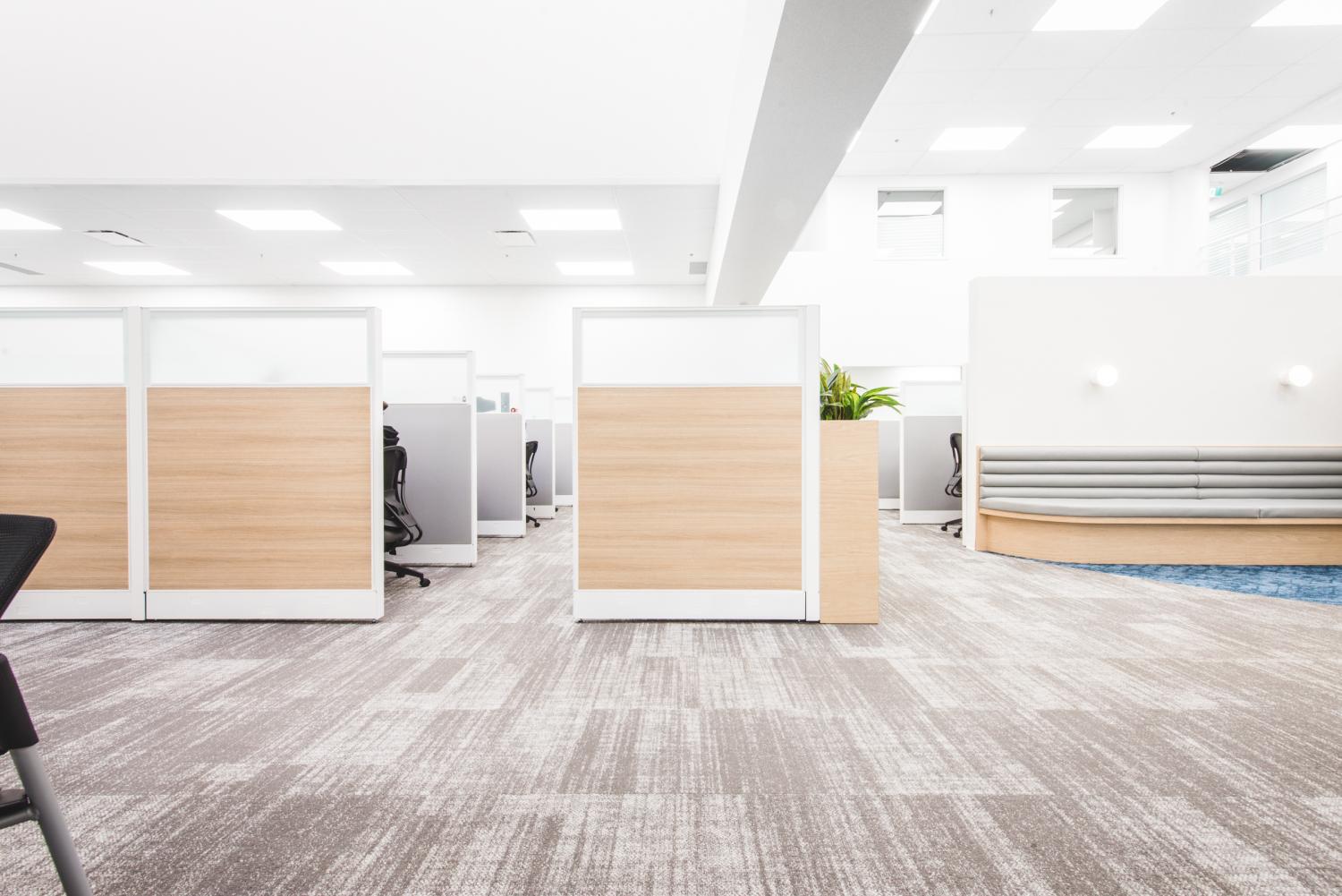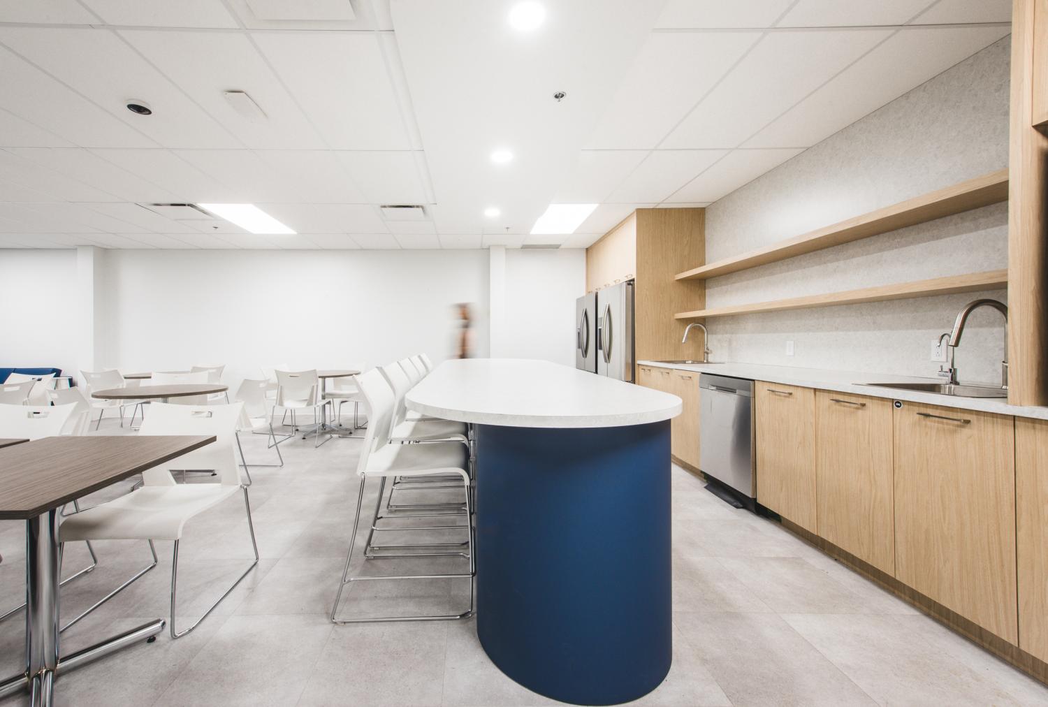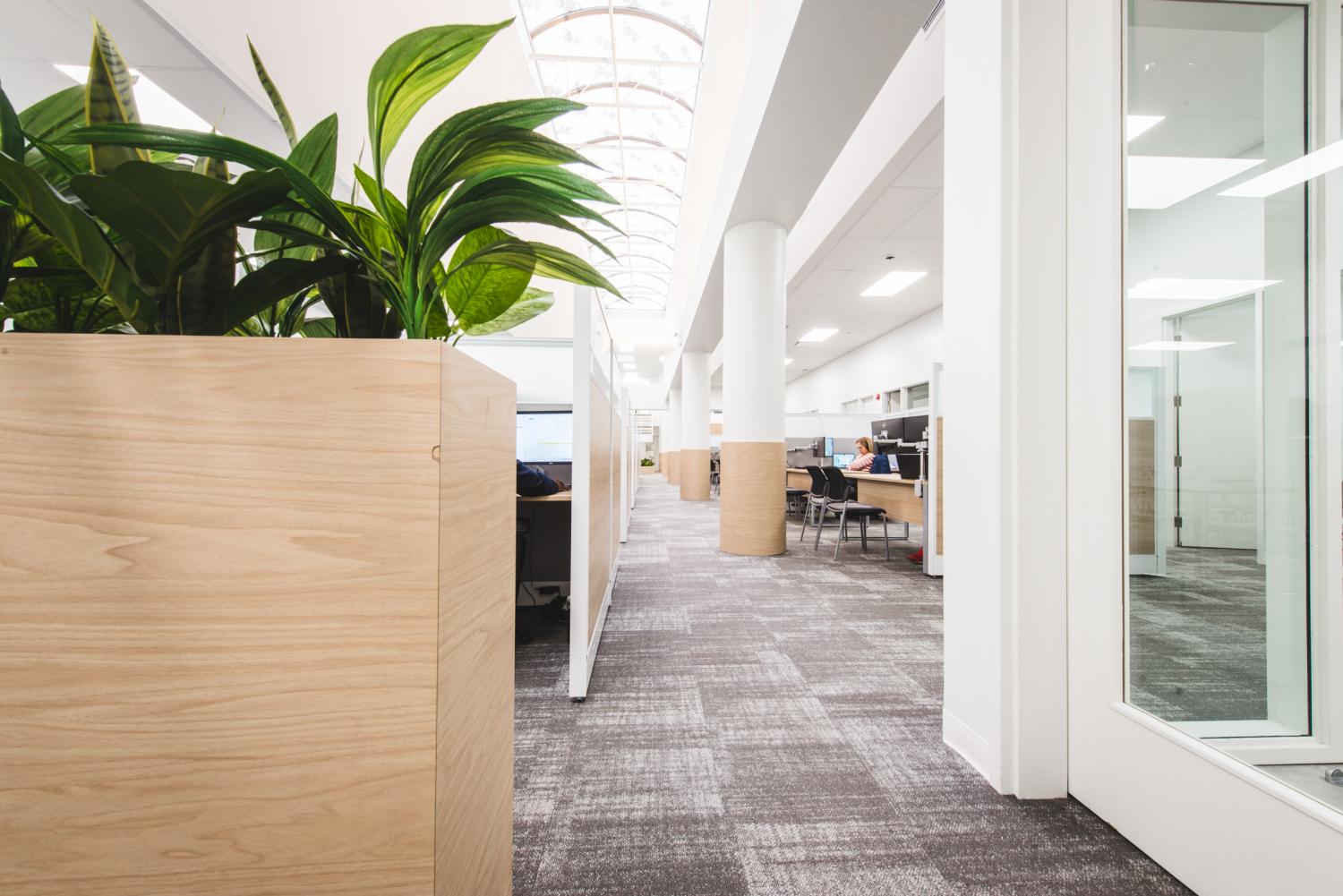 Les aménagements du Call Center Mont-Royal misent sur une optimisation maximale de l’espace afin d’intégrer un grand nombre de postes de travail, sans compromettre la qualité de l’environnement. L’architecture, marquée par un effet de mezzanine, organise les volumes et apporte du rythme à l’espace, tandis que les puits de lumière baignent l’ensemble de lumière naturelle, valorisant le lieu avec clarté et légèreté.