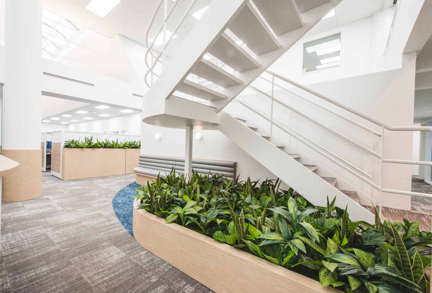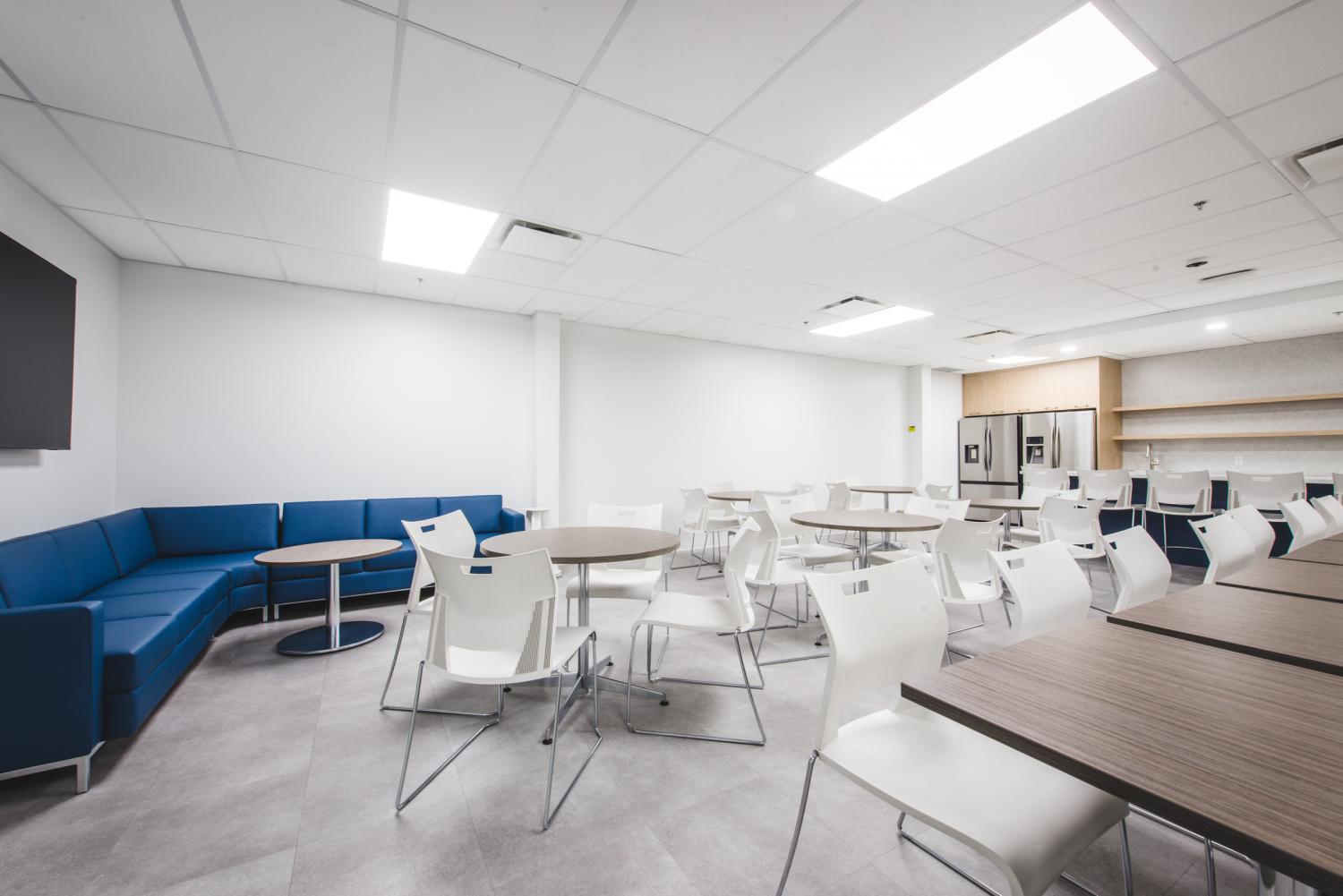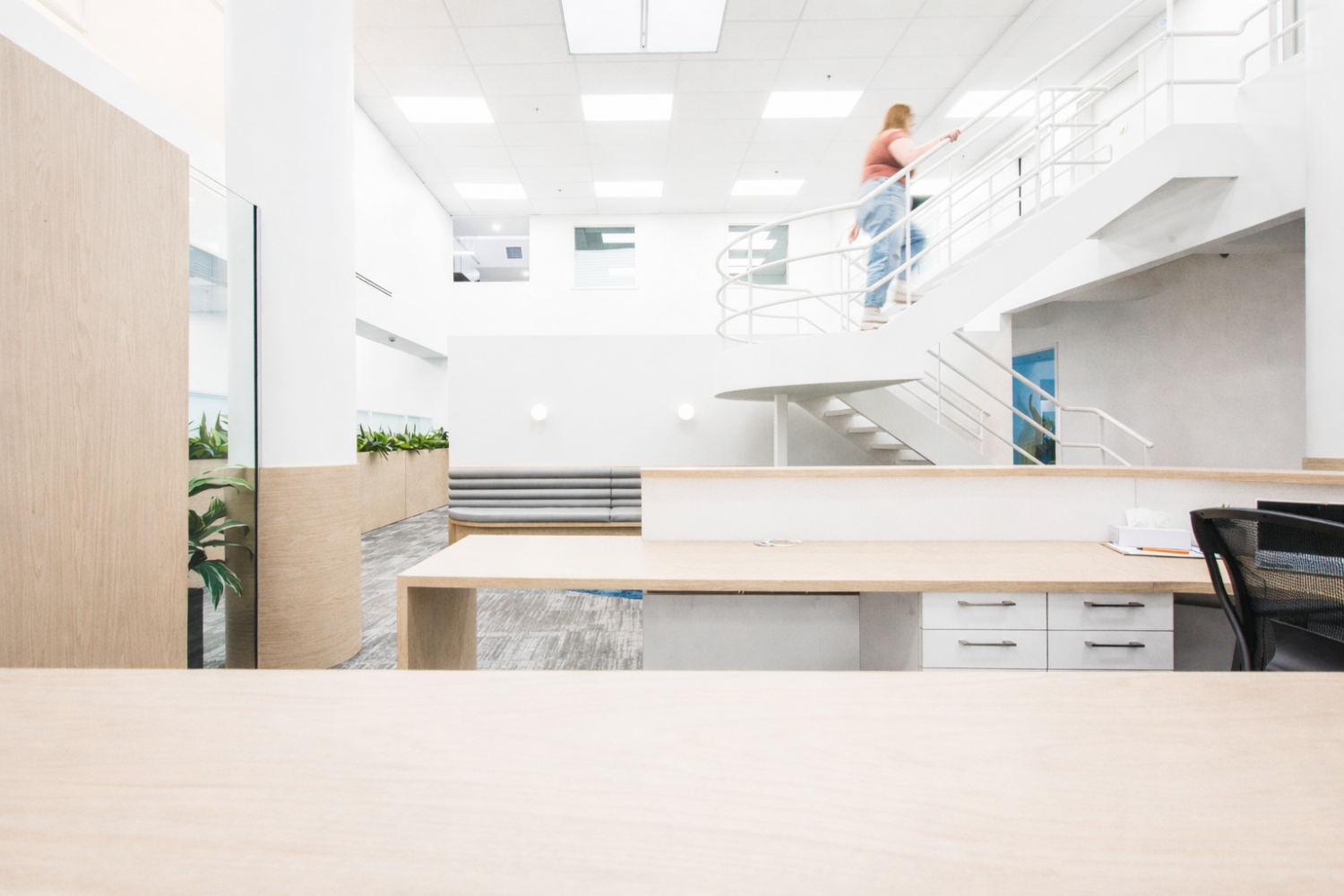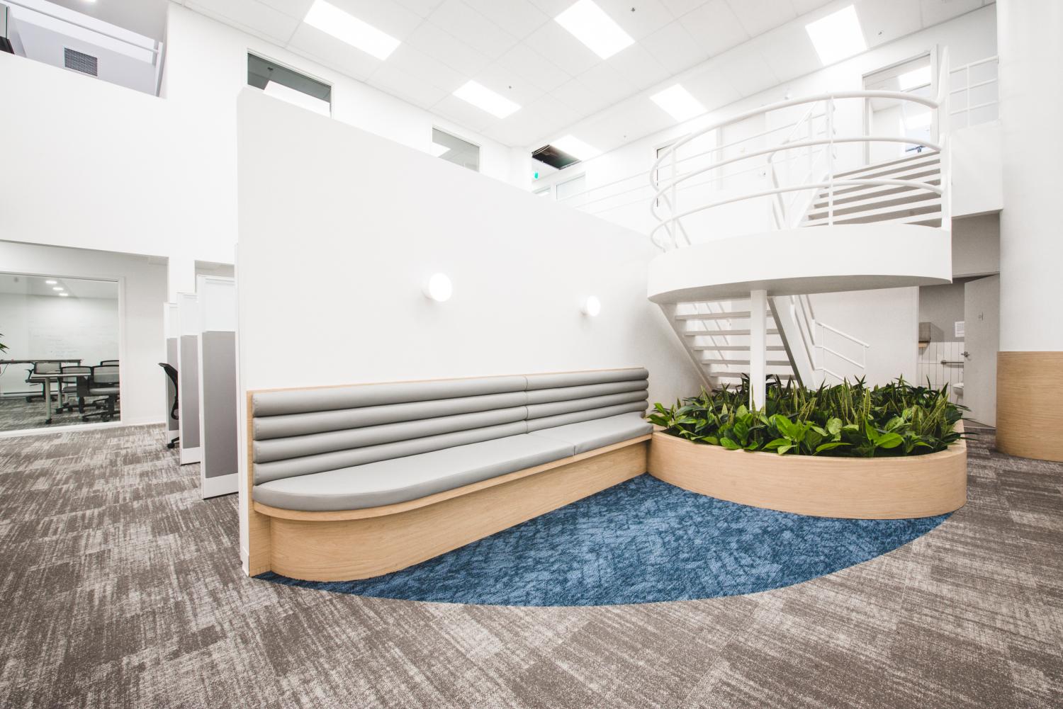 Les aménagements du Call Center Mont-Royal misent sur une optimisation maximale de l’espace afin d’intégrer un grand nombre de postes de travail, sans compromettre la qualité de l’environnement. L’architecture, marquée par un effet de mezzanine, organise les volumes et apporte du rythme à l’espace, tandis que les puits de lumière baignent l’ensemble de lumière naturelle, valorisant le lieu avec clarté et légèreté.