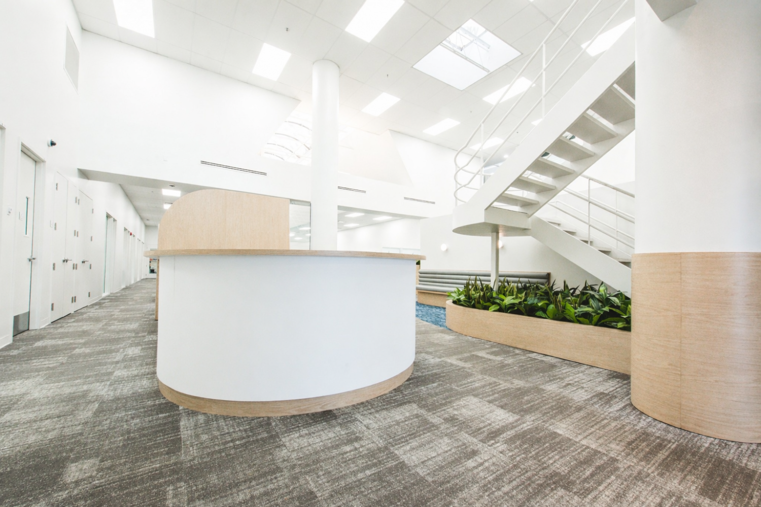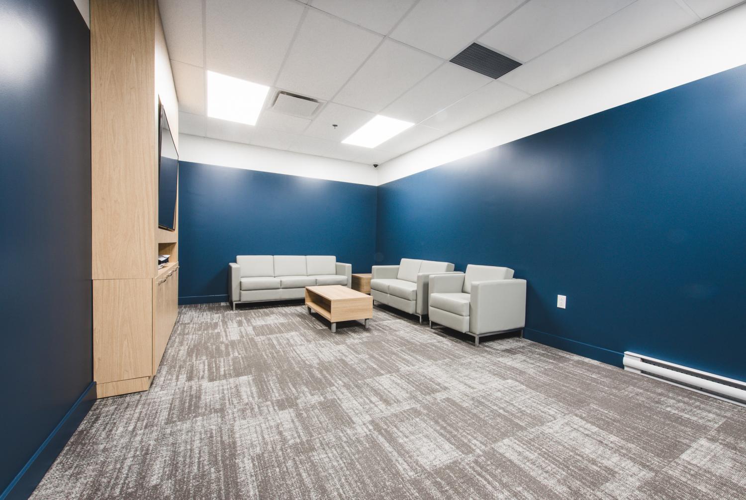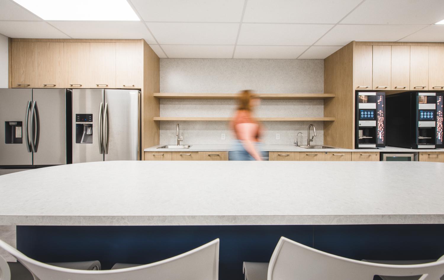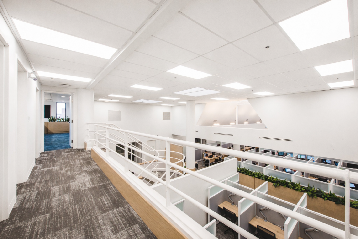 Les aménagements du Call Center Mont-Royal misent sur une optimisation maximale de l’espace afin d’intégrer un grand nombre de postes de travail, sans compromettre la qualité de l’environnement. L’architecture, marquée par un effet de mezzanine, organise les volumes et apporte du rythme à l’espace, tandis que les puits de lumière baignent l’ensemble de lumière naturelle, valorisant le lieu avec clarté et légèreté.