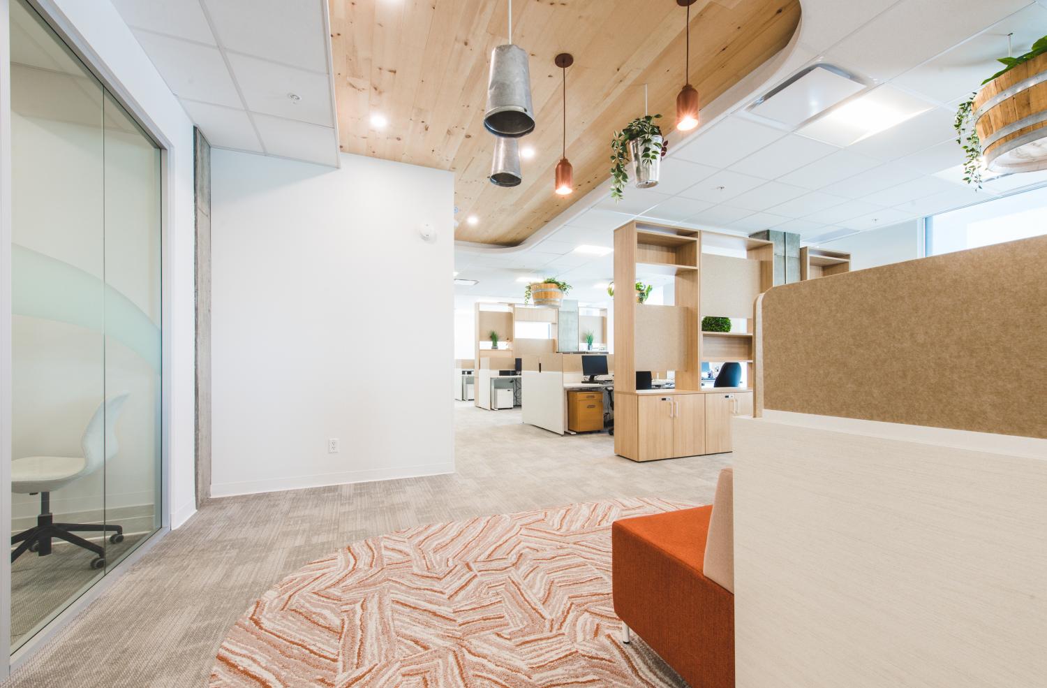 Le projet des bureaux de Tourisme Montérégie, situés à Brossard, a été guidée par le désir de marier joie de vivre et fonctionalité. En hommage à la richesse viticole de la région, des tonneaux de bois sur mesure occupent une place centrale dans le design. Réinventés, ils apportent une touche à la fois distinctive et chaleureuse, transformant cet espace en un clin d’œil audacieux au terroir montérégien. Le résultat ? Un espace accueillant et inspirant, qui reflète avec justesse l’identité de la région.